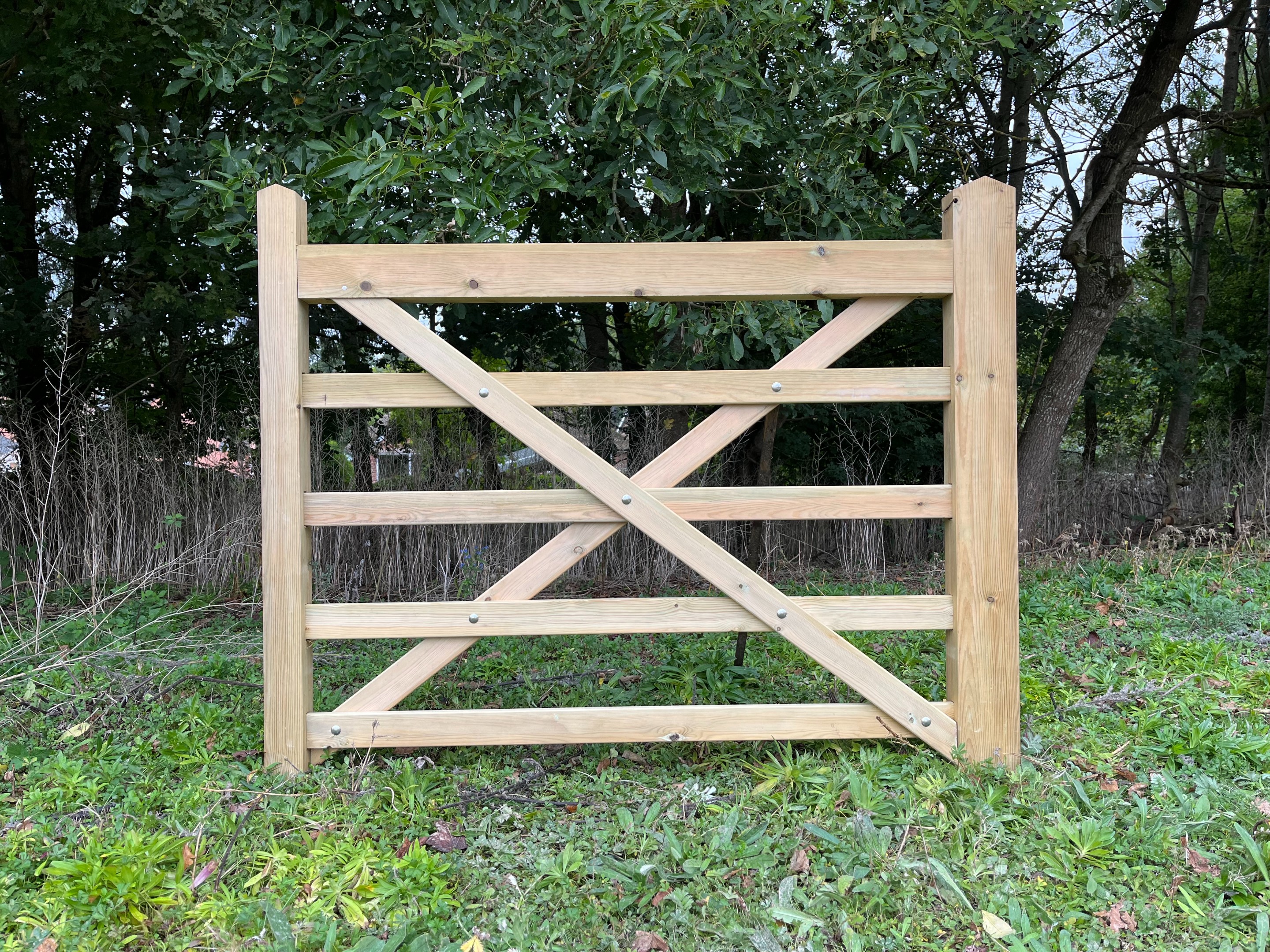 Image shows a left hand hanging 5'0 wide gate. The 5'0 gate is a diamond braced gate